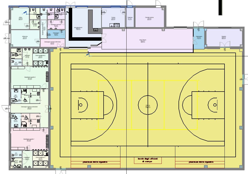 Il nuovo edificio presenta una pianta rettangolare di dimensioni complessive m 22,30 x 35,50 con altezza libera interna pari a ml. 9,00 attorno alla quale si sviluppano spazi per gli spogliatoi, magazzini, infermeria e locali tecnici di altezza diversificata e che consentono la dotazione dei servizi e attrezzature minime previste dalla normativa approvata con Deliberazione della Giunta Coni n.° 149 del 06/05/2008.
