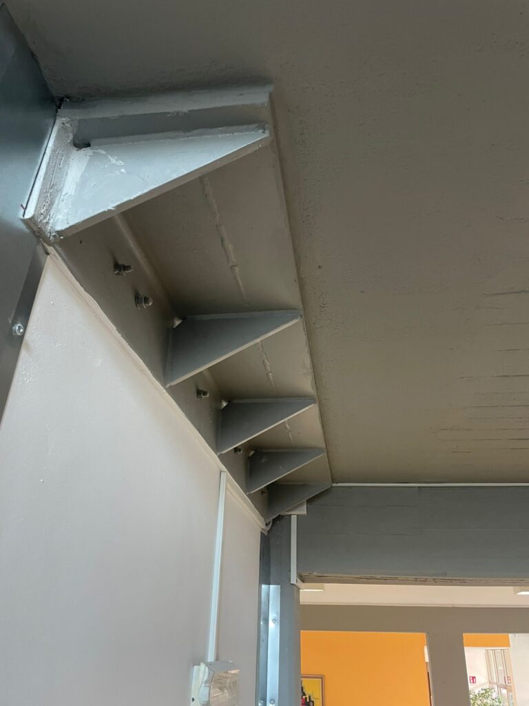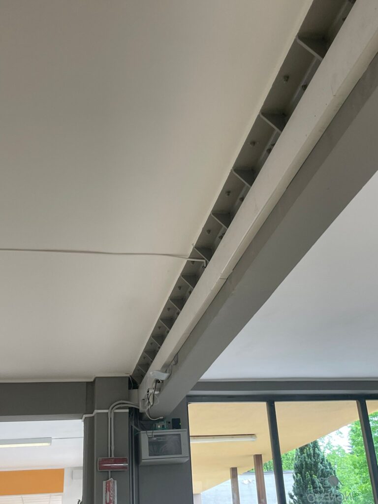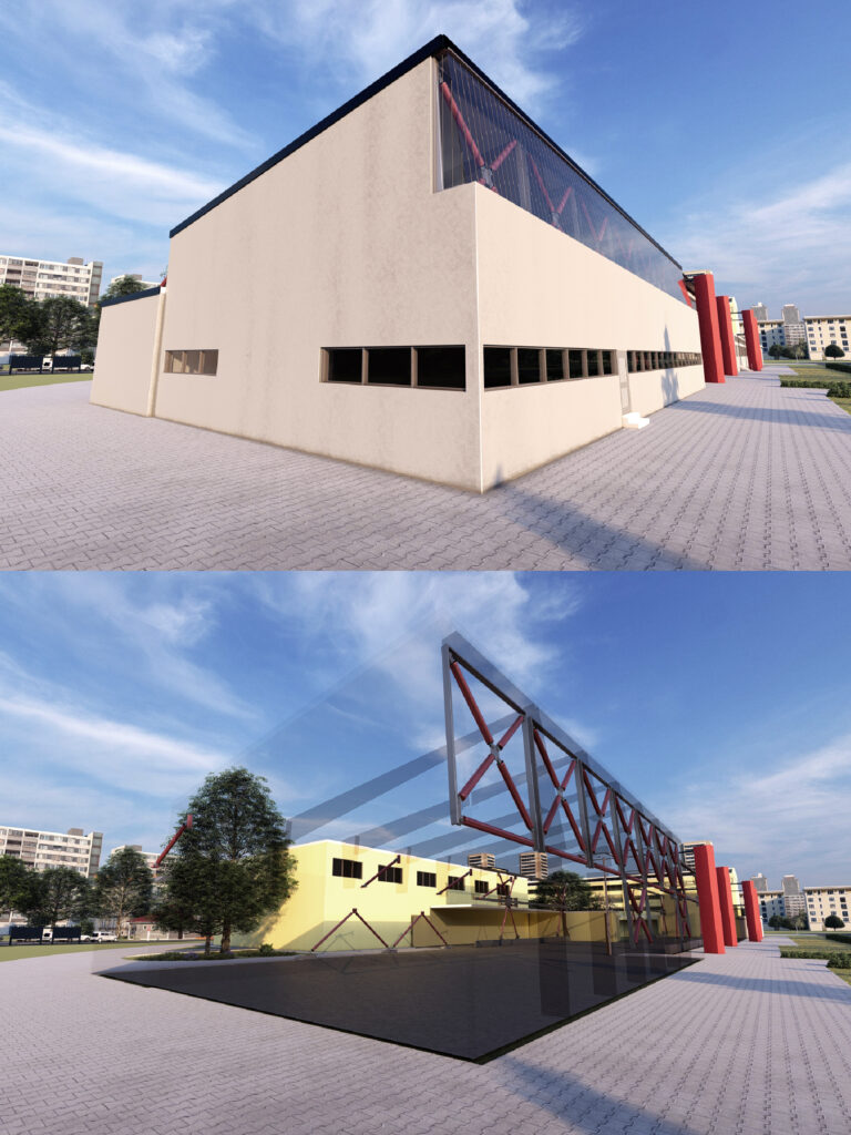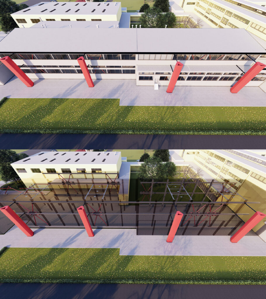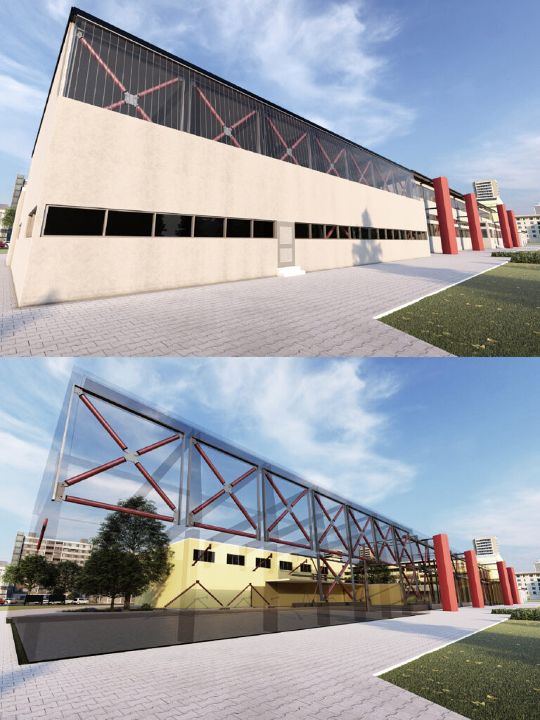 Per quanto riguarda la Palestra, ai fini dell’adeguamento sismico è sufficiente intervenire localmente su alcuni elementi strutturali al fine di risolvere singole carenze di capacità: si prevede però di realizzare un controventamento di piano in copertura mediante nuovi elementi di carpenteria metallica ad integrazione delle esistenti capriate. Visto lo stato di ammaloramento dell’orditura secondaria della copertura si prevede inoltre la sostituzione della stessa e del pannello accoppiato superiore.