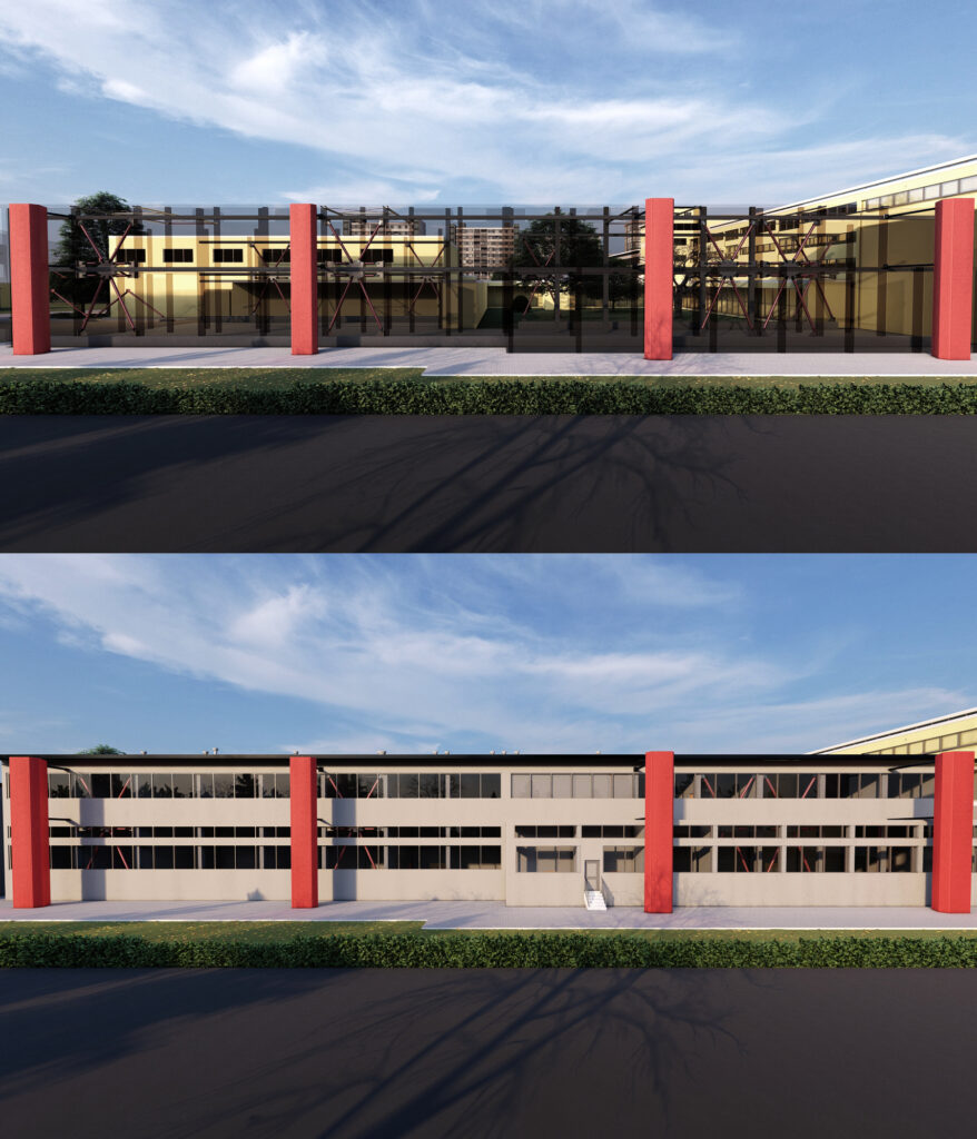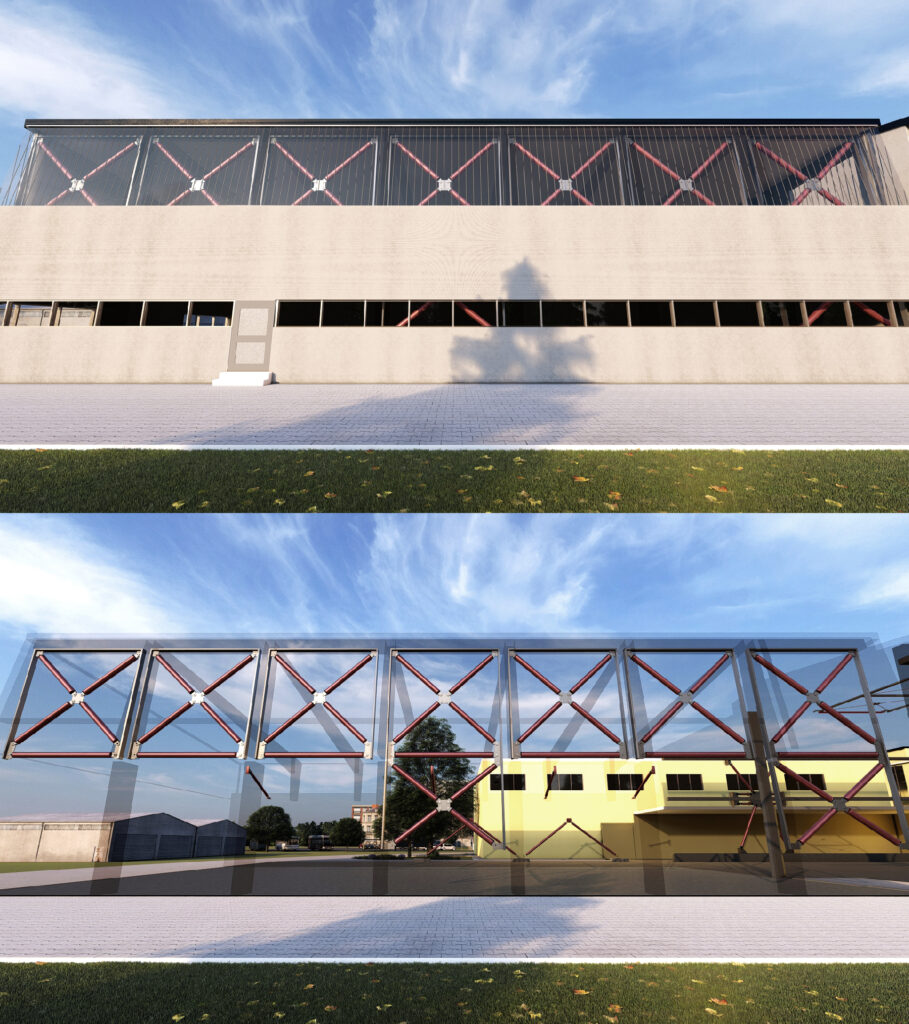 Per la Cartiera si prevede la realizzazione di un nuovo sistema di controventamento atto a regolarizzare il comportamento statico e sismico dell’edificio e ad assorbire la gran parte delle azioni orizzontali: l’intervento è necessario in quanto la struttura presenta uno schema statico caratteristico, connotato principalmente dai portali di copertura della porzione a doppio volume, più deformabili, e dalla retrostante porzione di fabbricato più bassa, più rigida ma eccentrica.