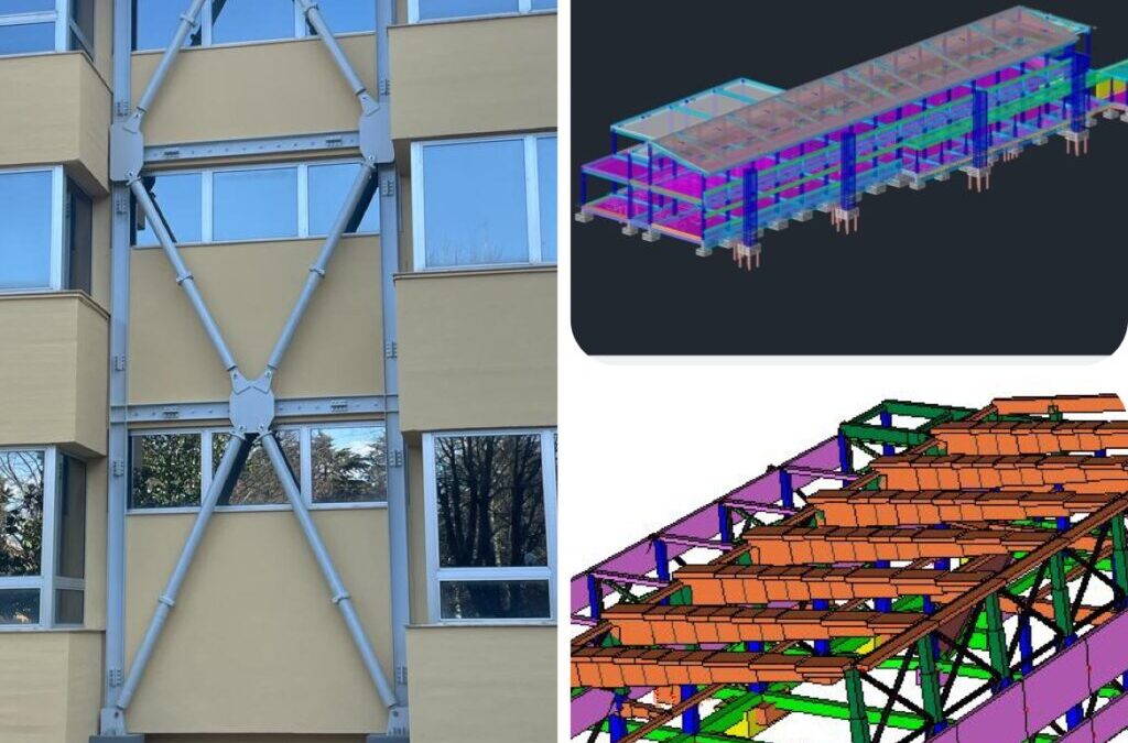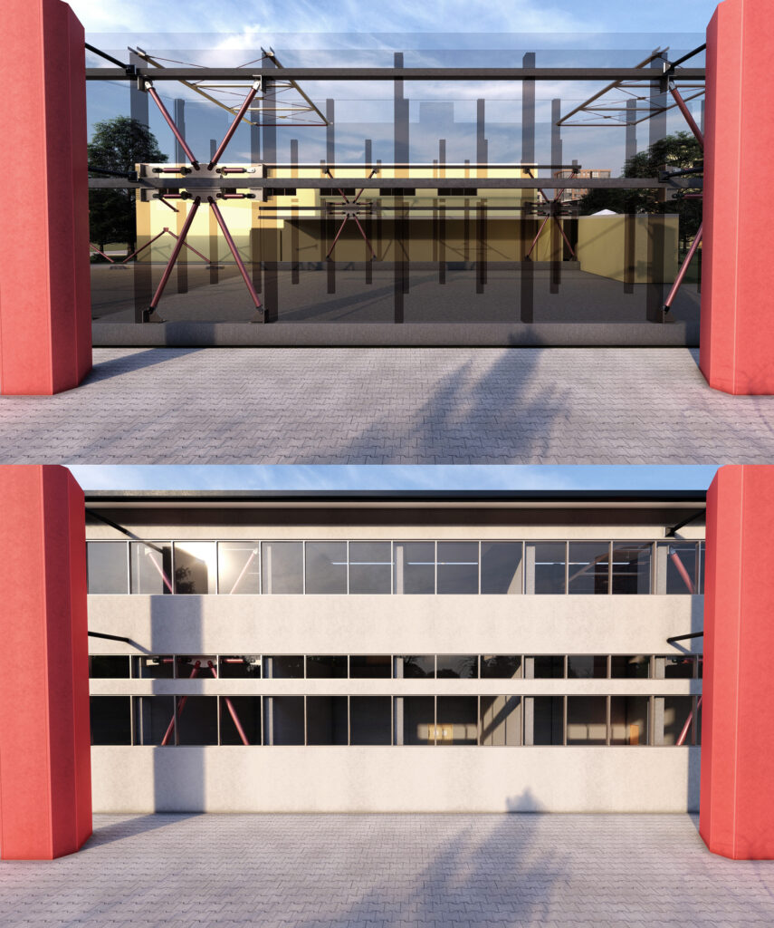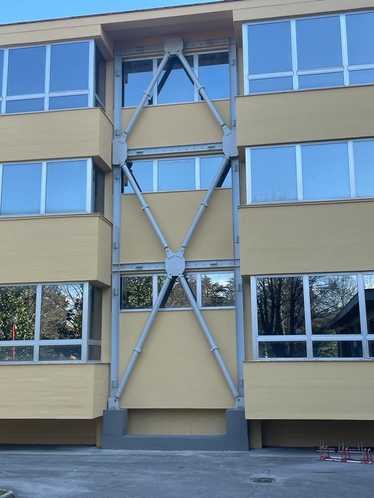 Le strutture di contrasto ed i controventi sono posizionati in pianta nel modo più omogeneo possibile, ma senza creare interferenze dal punto di vista architettonico-funzionale. Tutte le nuove strutture si estendono da cielo a terra, fondate su nuovi plinti su micropali; le strutture di contrasto sono realizzate in c.a. con sezione resistente a “V”, pensata per offrire sufficiente rigidezza e minimo impatto visivo, mentre i controventi sono costituiti da tubolari in acciaio disposti a “V” rovescia nella prima elevazione e a “V” nella seconda.