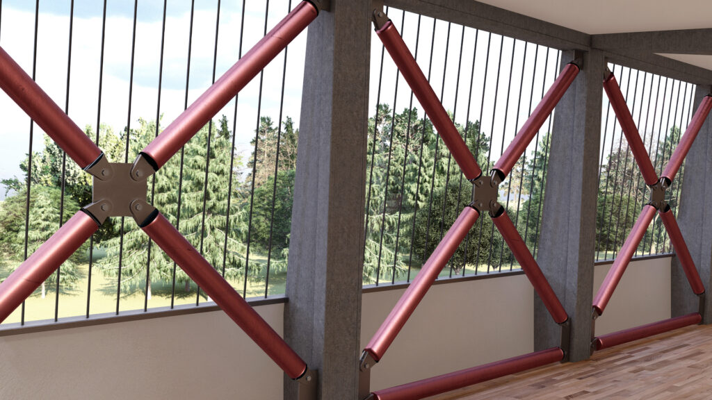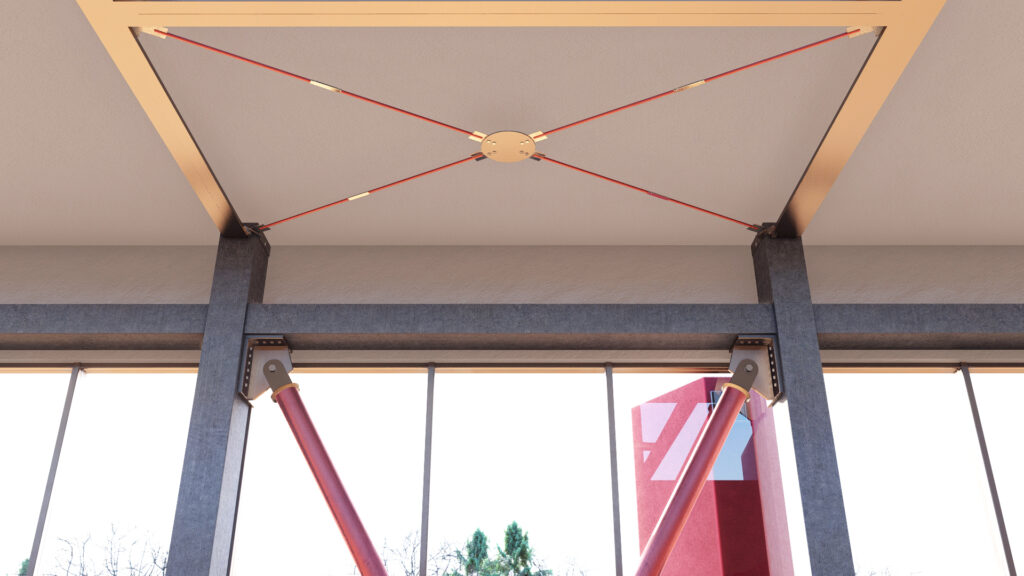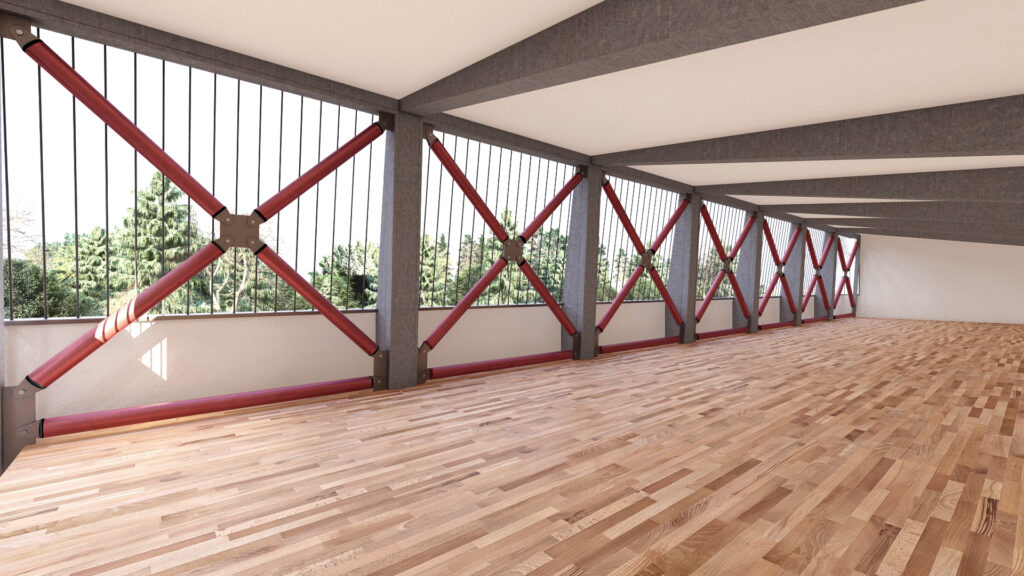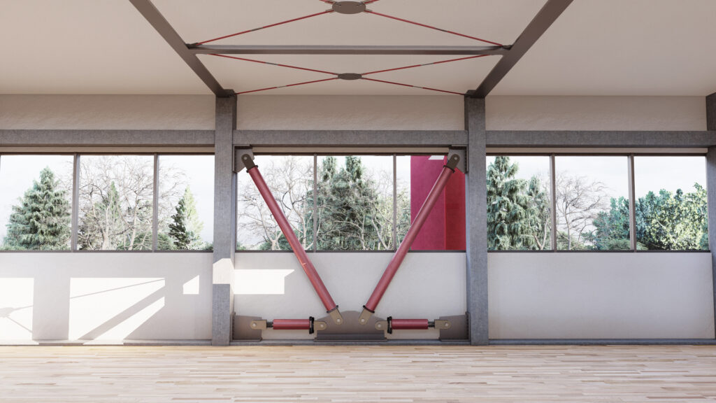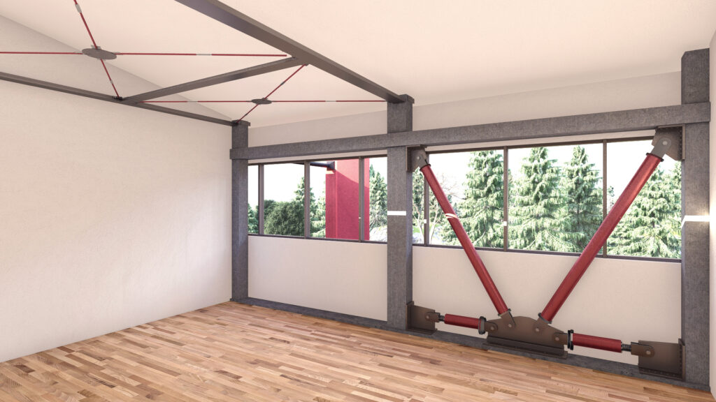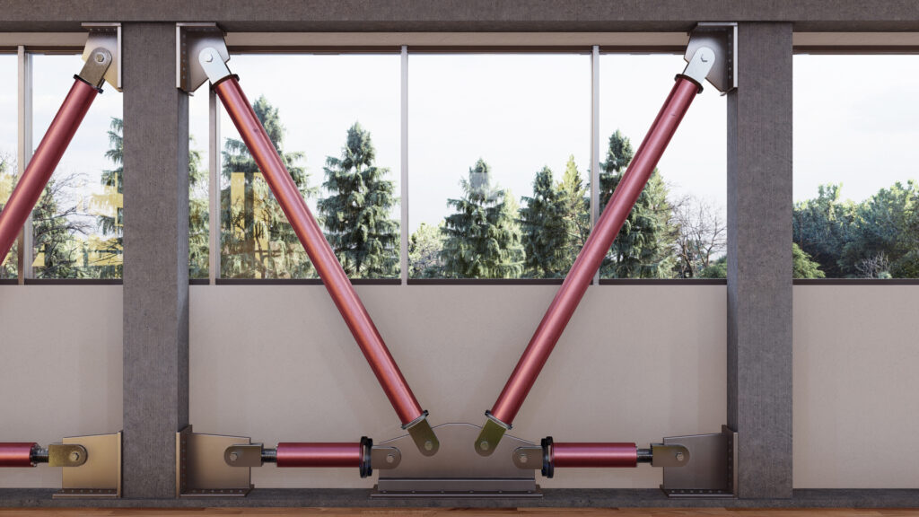 I dispositivi viscosi sono posizionati orizzontalmente, in corrispondenza dei solai di piano. Non essendo dotati di rigidezza elastica, permettono di introdurre smorzamento aggiuntivo senza aumentare la rigidezza del sistema: le caratteristiche di progetto sono state tarate al fine di massimizzare l’energia dissipata minimizzando le forze scambiate tra le strutture di contrasto e quelle esistenti.
