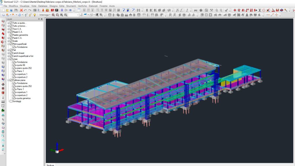 Allo stato di progetto, la struttura principale dell’edificio è collegata alle strutture di contrasto e ciascun orizzontamento è collegato con quello superiore mediante dispositivi antisismici con dissipatori viscosi: in fase sismica, lo spostamento relativo dovuto alla differente risposta dinamica tra la costruzione esistente ed i contrasti e tra i diversi impalcati, attiva il meccanismo di tipo cilindro/pistone dei dispositivi, in cui la laminazione di un fluido attraverso un idoneo circuito idraulico permette la dissipazione di energia.