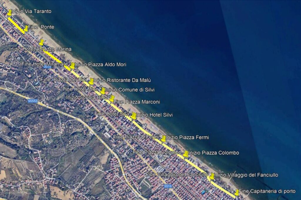 L’area di intervento considerata è il lungomare di Silvi che può essere sinteticamente descritto come un’area a servizio della spiaggia, degli hotel e dei locali commerciali, oltre a quanti hanno il privilegio di avere casa a ridosso dell’arenile. In quest’area coesistono aree di pregio utilizzate a parcheggio dagli alberghi, una strada lungomare, ovvero un’ampia striscia di asfalto, gli stabilimenti balneari affastellati, il tutto costituisce il paesaggio quotidiano di quella che dovrebbe essere l’area di maggior pregio della Silvi turistica e, invece, è concepito in maniera “tradizionale” con l’unico obiettivo di arredare uno spazio pubblico.
