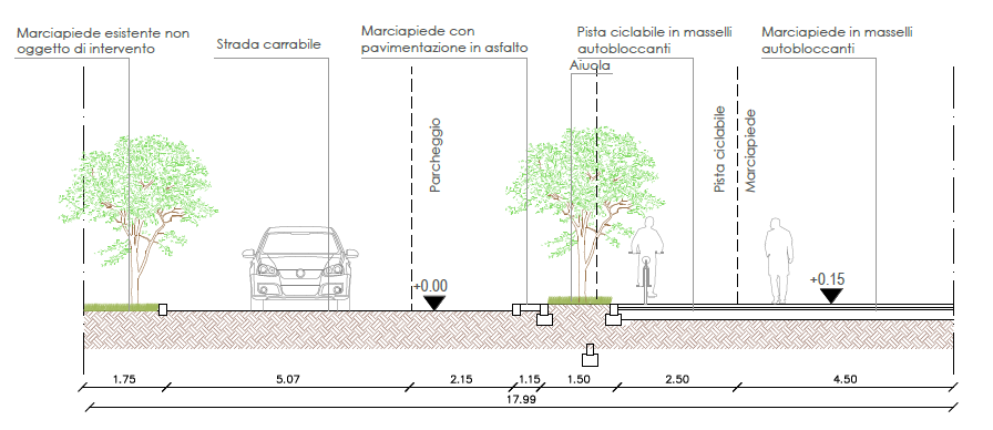 - riqualificazione dei marciapiedi coerentemente con il nuovo assetto dell’asse stradale; questi saranno realizzati con pavimentazione in masselli autobloccanti e consentono il passaggio anche alle persone con ridotte capacità motorie;